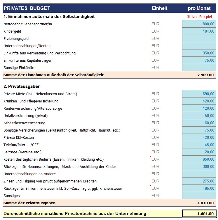 Starten Sie mit der Eingabe aller Einnahmen, die außerhalb der Selbständigkeit erzielt werden. Bei den Privatausgaben sind neben den Lebenshaltungskosten insbesondere auch Positionen wie Ersparnisbildung, Kranken- und Sozialversicherung und (häufig übersehen) Rücklagen für die Einkommensteuer zu berücksichtigen. Ansonsten kann es zu „bösen Überraschungen“ kommen, wenn die Unternehmung gut läuft und Sie wegen hoher Privatentnahmen (= Gewinnentnahmen) rückwirkend entsprechend viel Einkommensteuer zahlen müssen.