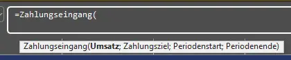 - Die Verwendung ist einfach (auch für Laien, welche ggf. die komplette Logik nicht nachvollziehen möchten oder können): Nach Eingabe von =Zahlungseingang( wird automatisch eine Hilfe mit den einzugebenden Parametern sichtbar: