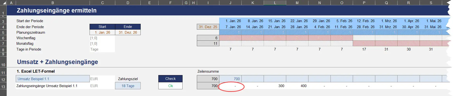 Eine einfache Kontrollzelle (vgl. F13) zeigt, ob die jeweiligen Zeilensummen der Umsätze (I12) und die der Zahlungseingänge (I13) gleich hoch sind. Die Kontrollformel funktioniert natürlich nur, solange alle Einzahlungen noch innerhalb des betrachteten Zeitraums liegen (im Bsp. nur bis 31.12.2026).