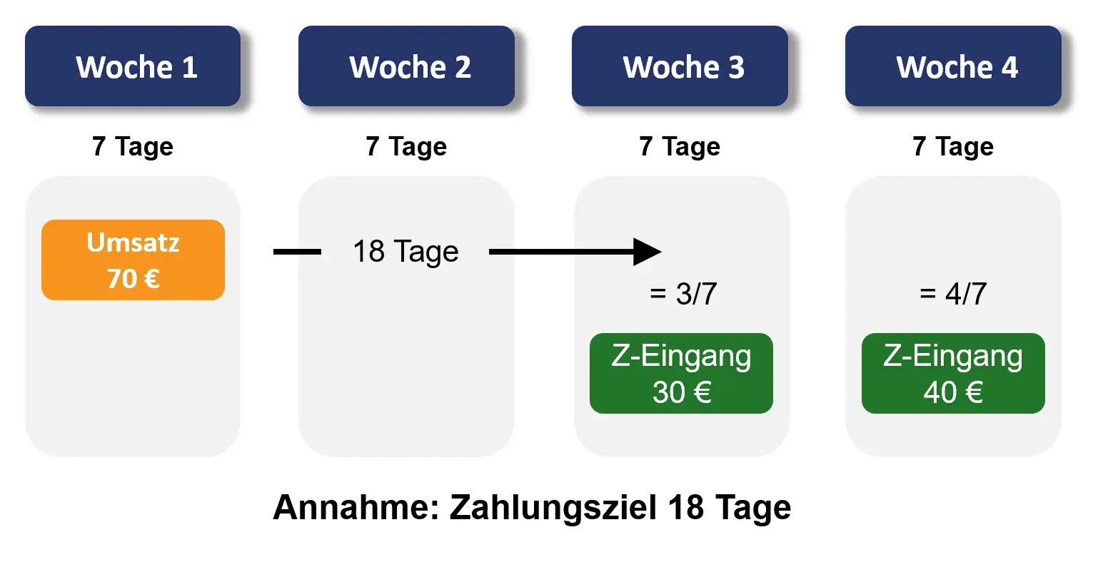 Die eigentliche Berechnung der Höhe des Zahlungseingangs erfolgt am Ende durch Multiplikation des Umsatzes pro Tag (im Bsp. 70 € Umsatz geteilt durch 7 Tage (Woche 1) = 10 €) mit der Anzahl der überlappenden Tage in der bzw. den Zielperiode(n). Im Bsp. 3 x 10 € in Woche 3 und 4 x 10 € in Woche 4. Die Summe dieser Anteile (3/7 und 4/7) über alle Perioden ergibt schließlich 100% und entspricht damit dem ursprünglichen Umsatz in der Ausgangs- bzw. Umsatzperiode. Abb. 1 zeigt schematisch die Vorgehensweise mit Hilfe eines einfachen Zahlenbeispiels.